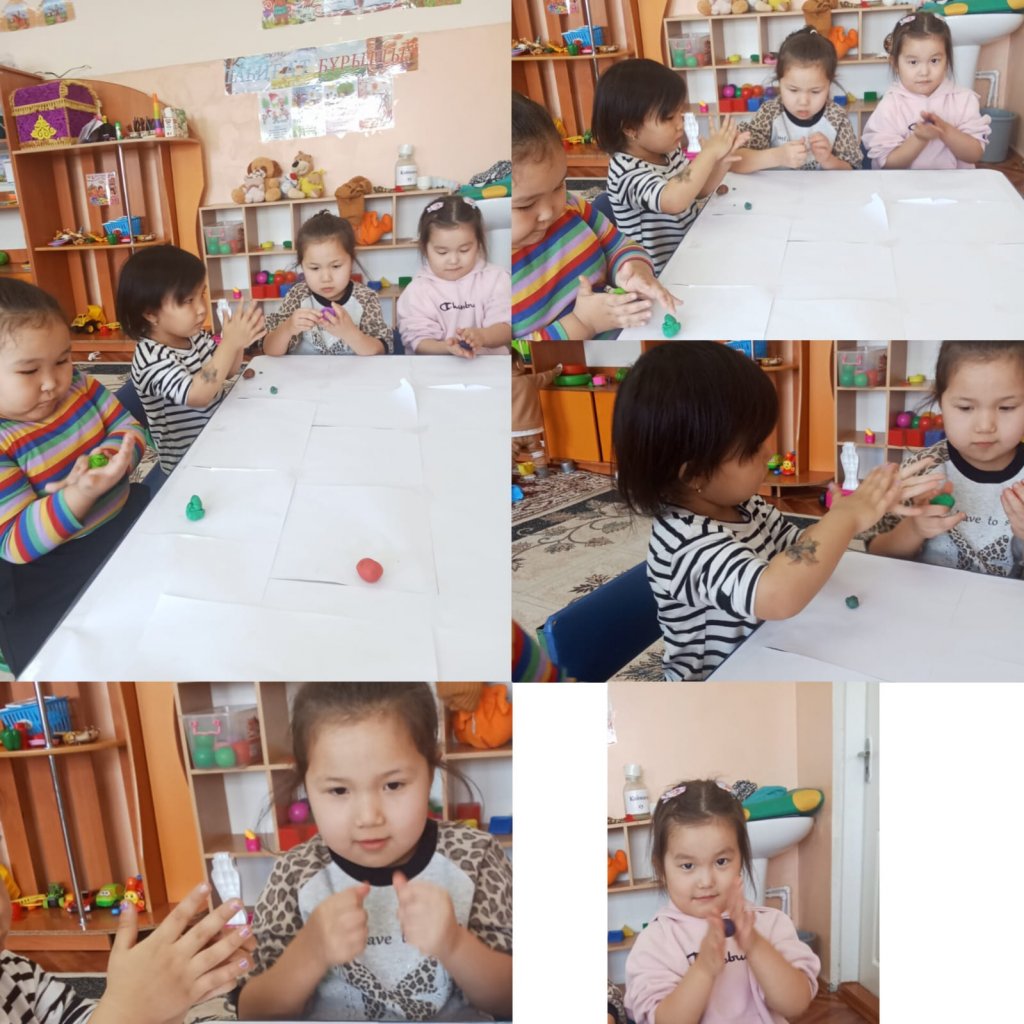 "Қуаныш " ШО ортаңғы және ересек топ бүлдіршіндерімен ептілік,жылдамдық қасиеттерін дамыту мақсатында"Түрлі пішіндер" ермексазбен жұмыс жасау көрінісі